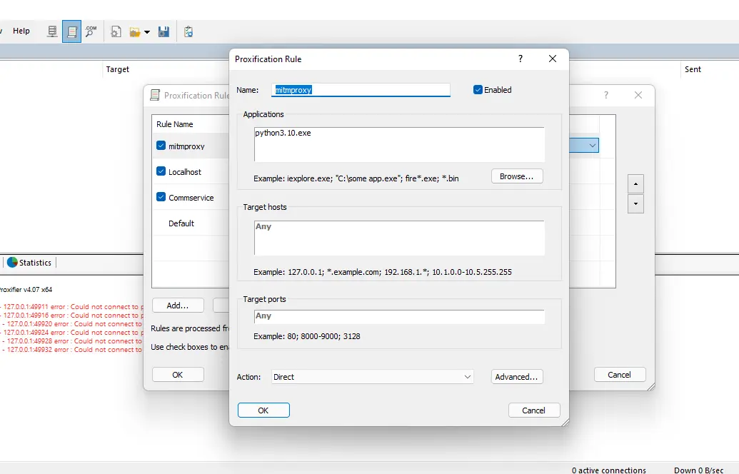 Now temporarly add proxification rule for your web browser in Proxifier and launch mitmproxy on port we configured.